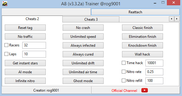 | Trainer for the game Asphalt 8: Airborne, you can use it to activate these essential Cheat Codes: Free Upgrades, Laps, Money Mode, Try all Cars, Get 1st Positon, Free Booster, Perfect Nitro, Safe Crash, Season Unlock. | ||||